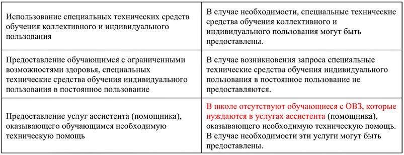 Здание общеобразовательного учреждения обеспечивает беспрепятственный доступ лиц с ограниченными возможностями здоровья (ОВЗ). Имеются пандусы, разметка пути следования по территории, беспрепятственное передвижение в здании, устройство для межэтажной транспортировки, кнопка вызова, табличка Брайля, тактильные плитки и другие приспособления.